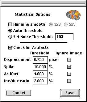 While processing the data, scanSTAT is also calculating the correlation between the behavioral paradigm and the detected image motion, the coefficient of correlation is shown just below the images during and after calculation. As of this writing, we have not carefully validated these numbers, so you should take them with a grain of salt. Nevertheless, if the correlation is high, you might consider that the correlated pixels relate to motion that is synchronous with the task. A future revision of scanSTAT will show you the locations of pixels whose 'activation' is best explained by motion. Note also that at the moment scanSTAT looks only at in-plane motion, though through-plane motion will be included in later releases.